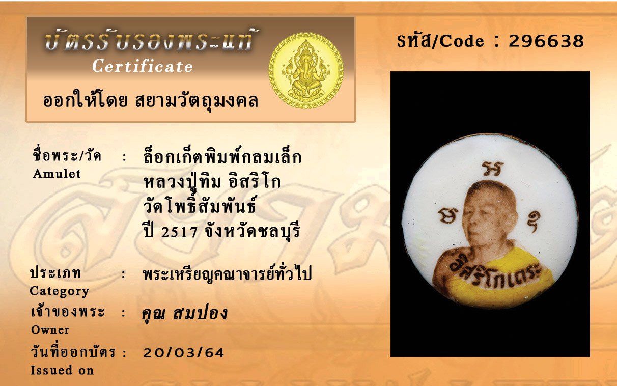 รหัสสินค้า : 296638 ล็อกเก็ตพิมพ์กลมเล็ก หลวงปู่ทิม อิสริโก วัดโพธิ์สัมพันธ์ปีพ.ศ 2517 จังหวัดชลบุรี