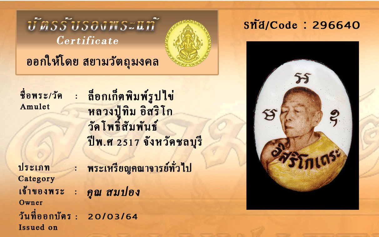 รหัสสินค้า : 296640 ล็อกเก็ตพิมพ์รูปไข่ หลวงปู่ทิม อิสริโก วัดโพธิ์สัมพันธ์ปีพ.ศ 2517 จังหวัดชลบุรี