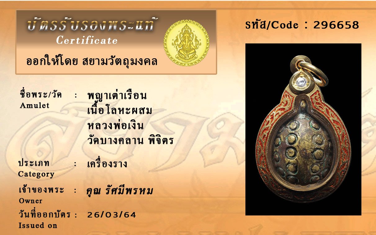 รหัสสินค้า : 296658 พญาเต่าเรือน เนื้อโลหะผสม หลวงพ่อเงิน วัดบางคลาน พิจิตร