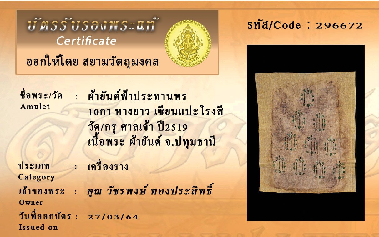 รหัสสินค้า : 296672 ผ้ายันต์ฟ้าประทานพร 10กา เซียนแปะโรงสี หางยาว วัด/กรุ ศาลเจ้า จ.ปทุมธานี เนื้อพระ ผ้ายันต์ ออกปี19