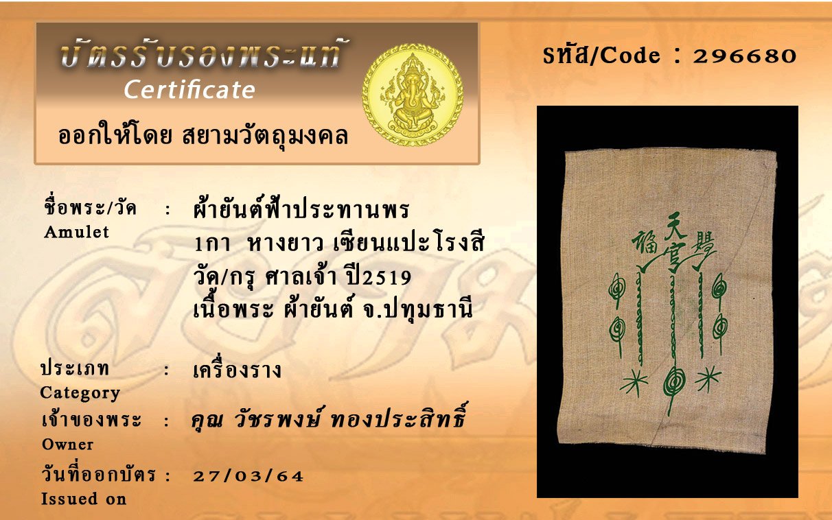 รหัสสินค้า : 296680 ผ้ายันต์ฟ้าประทานพร 1กา เซียนแปะโรงสี หางยาว วัด/กรุ ศาลเจ้า จ.ปทุมธานี เนื้อพระ ผ้ายันต์ ออกปี19