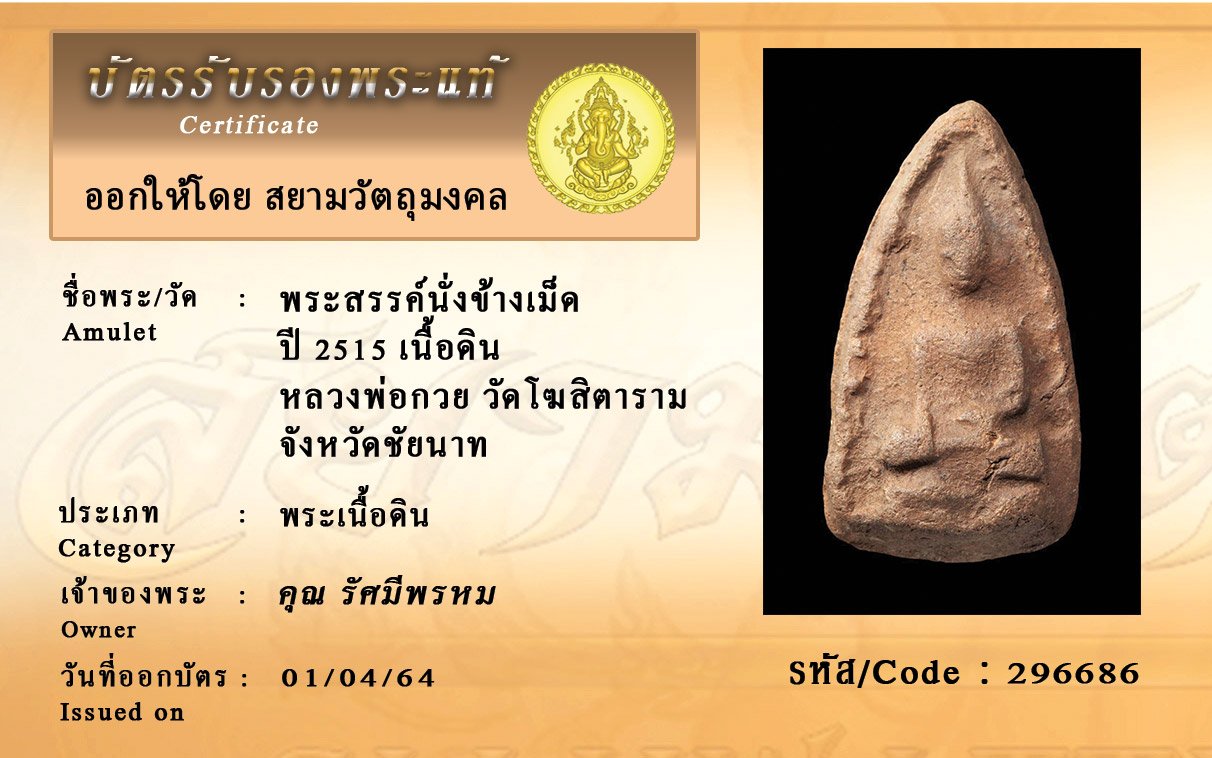 รหัสสินค้า : 296686 พระสรรค์นั่งข้างเม็ด ปี 2515 เนื้อดิน หลวงพ่อกวย วัดโฆสิตาราม จังหวัดชัยนาท