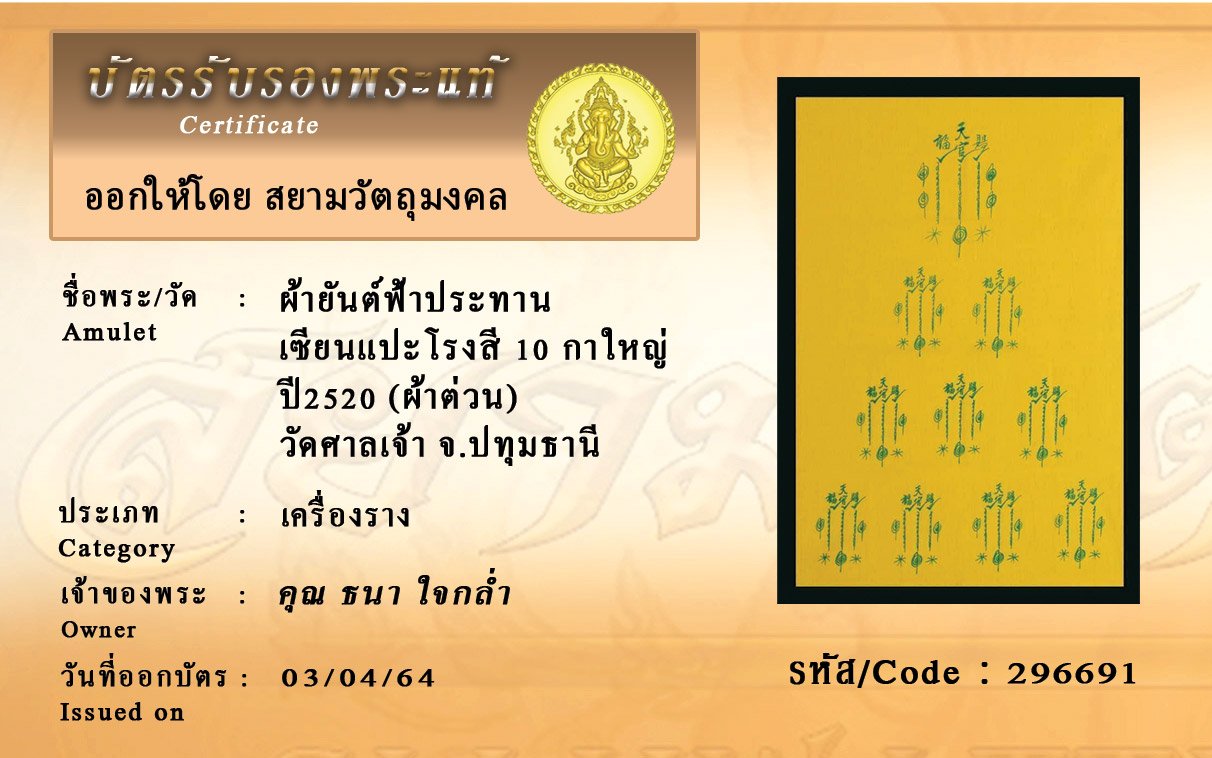รหัสสินค้า : 296691 ผ้ายันต์ฟ้าประทาน เซียนแปะโรงสี 10 กาใหญ่ ปี2520 (ผ้าต่วน) วัดศาลเจ้า จ.ปทุมธานี
