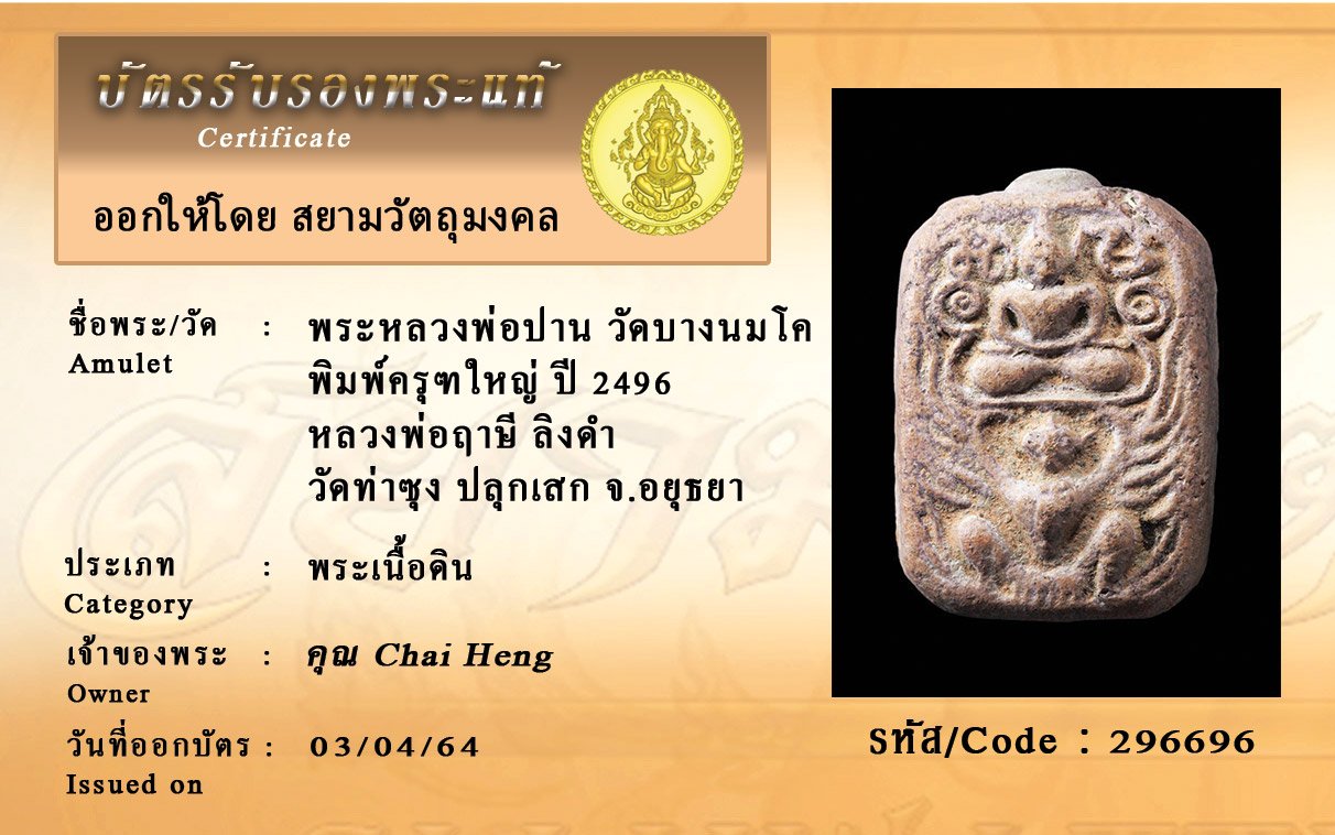 รหัสสินค้า : 296696 พระหลวงพ่อปาน วัดบางนมโค พิมพ์ครุฑใหญ่ ปี 2496 หลวงพ่อฤาษี ลิงดำ วัดท่าซุง ปลุกเสก จังหวัดอยุธยา