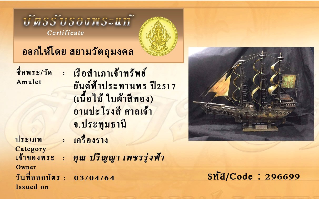 รหัสสินค้า : 296699 เรือสำเภาเจ้าทรัพย์ ยันต์ฟ้าประทานพร ปี2517 (เนื้อไม้ ใบผ้าสีทอง) อาแปะโรงสี ศาลเจ้า จ.ประทุมธานี