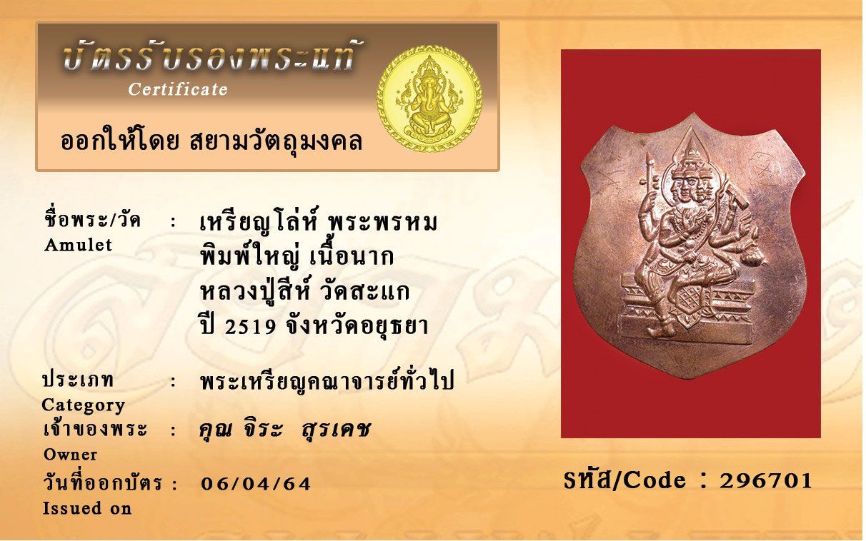 รหัสสินค้า : 296701 เหรียญโล่ห์ พระพรหม พิมพ์ใหญ่ เนื้อนาก หลวงปู่สีห์ วัดสะแก ปี 2519 จังหวัดอยุธยา