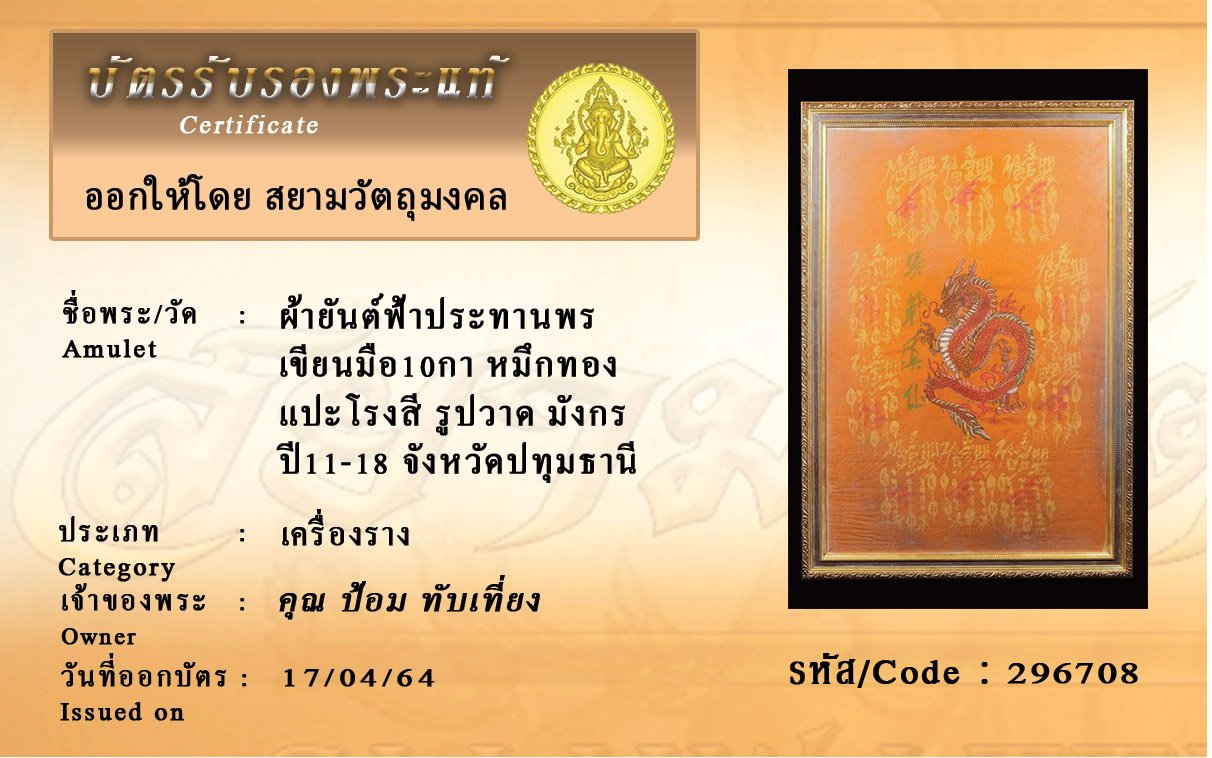 รหัสสินค้า : 296708 ผ้ายันต์ฟ้าประทานพร เขียนมือ10กา หมึกทอง แปะโรงสี รูปวาด มังกร ปี11-18 จังหวัดปทุมธานี