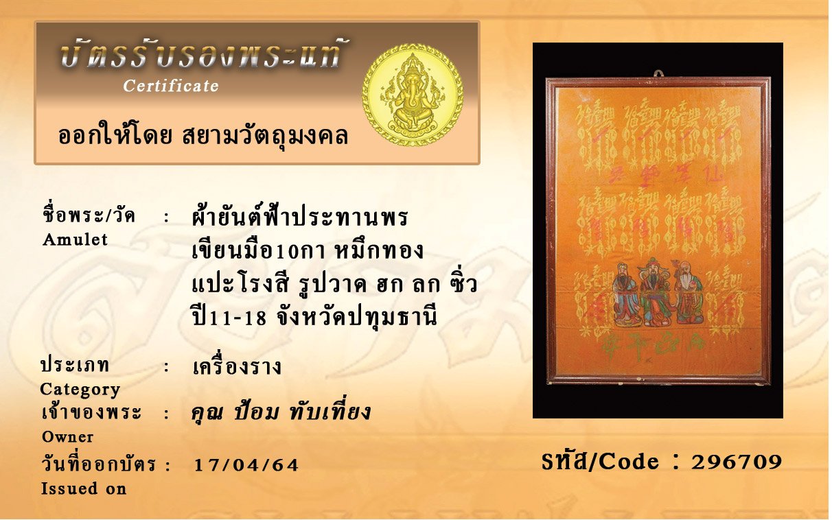 รหัสสินค้า : 296709 ผ้ายันต์ฟ้าประทานพร เขียนมือ10กา หมึกทอง แปะโรงสี รูปวาด ฮก ลก ซิ่ว ปี11-18 จังหวัดปทุมธานี
