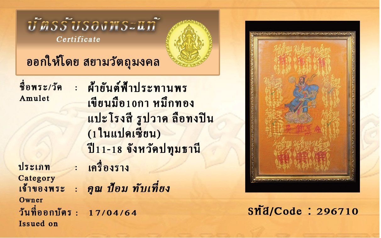 รหัสสินค้า : 296710 ผ้ายันต์ฟ้าประทานพร เขียนมือ10กา หมึกทอง แปะโรงสี รูปวาด ลือทงปิน (1ในแปดเซียน) ปี11-18 จังหวัดปทุมธานี