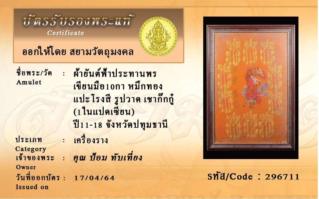 รหัสสินค้า : 296711 ผ้ายันต์ฟ้าประทานพร เขียนมือ10กา หมึกทอง แปะโรงสี รูปวาด เชาก๊กกู๋ (1ในแปดเซียน) ปี11-18 จังหวัดปทุมธานี