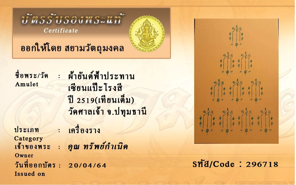 รหัสสินค้า : 296718 ผ้ายันต์ฟ้าประทาน เซียนแป๊ะโรงสี ปี 2519(เทียนเต็ม) วัดศาลเจ้า จ.ปทุมธานี