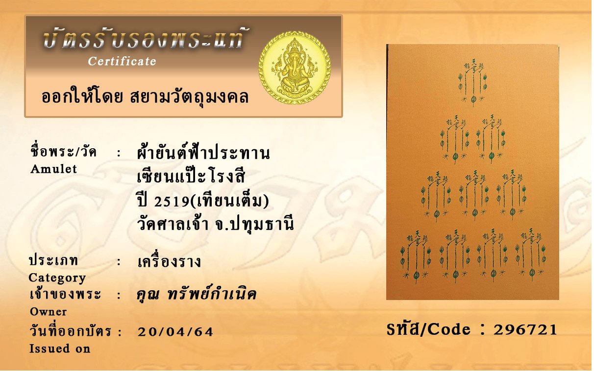รหัสสินค้า : 296721 ผ้ายันต์ฟ้าประทาน เซียนแป๊ะโรงสี ปี 2519(เทียนเต็ม) วัดศาลเจ้า จ.ปทุมธานี