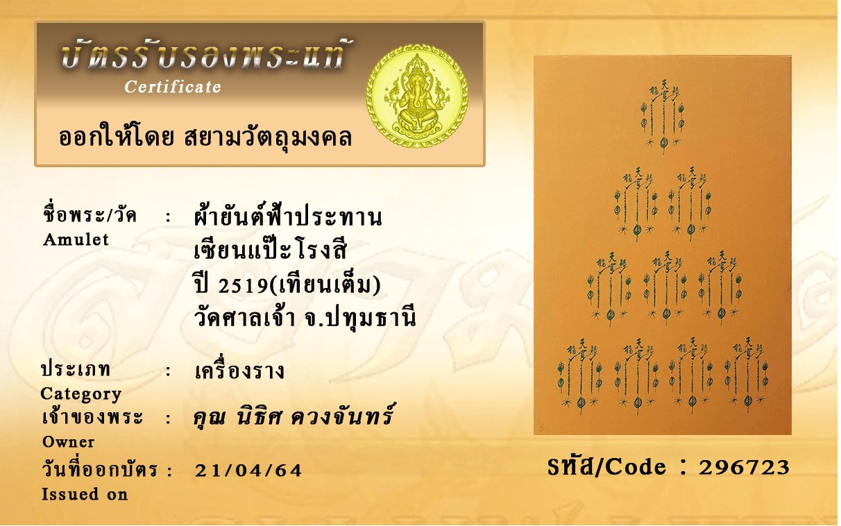 รหัสสินค้า : 296723 ผ้ายันต์ฟ้าประทาน เซียนแป๊ะโรงสี ปี 2519(เทียนเต็ม) วัดศาลเจ้า จังหวัดปทุมธานี