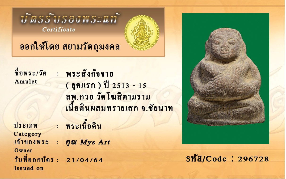 รหัสสินค้า : 296728 พระสังกัจจาย ( ยุคแรก ) ปี 2513 - 15 ลพ.กวย วัดโฆสิตามราม เนื้อดินผสมทรายเสก จ.ชัยนาท