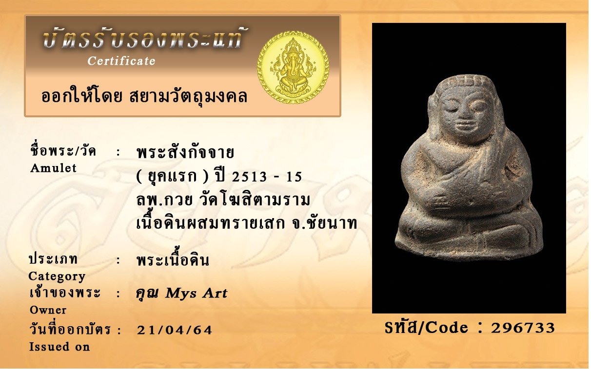 รหัสสินค้า : 296733 พระสังกัจจาย ( ยุคแรก ) ปี 2513 - 15 ลพ.กวย วัดโฆสิตามราม เนื้อดินผสมทรายเสก จ.ชัยนาท