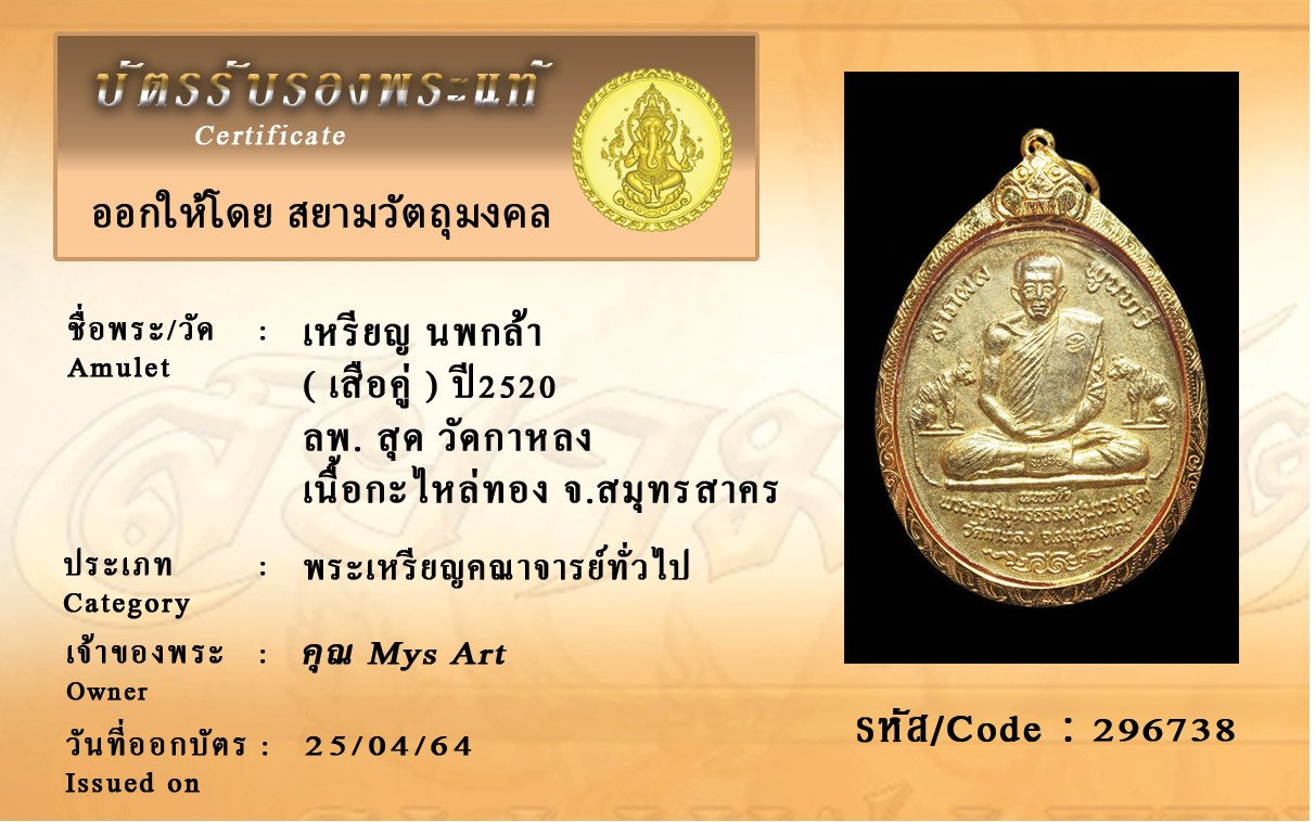 รหัสสินค้า : 296738 เหรียญ นพกล้า ( เสือคู่ ) ปี2520 ลพ. สุด วัดกาหลง เนื้อกะไหล่ทอง จังหวัดสมุทรสาคร