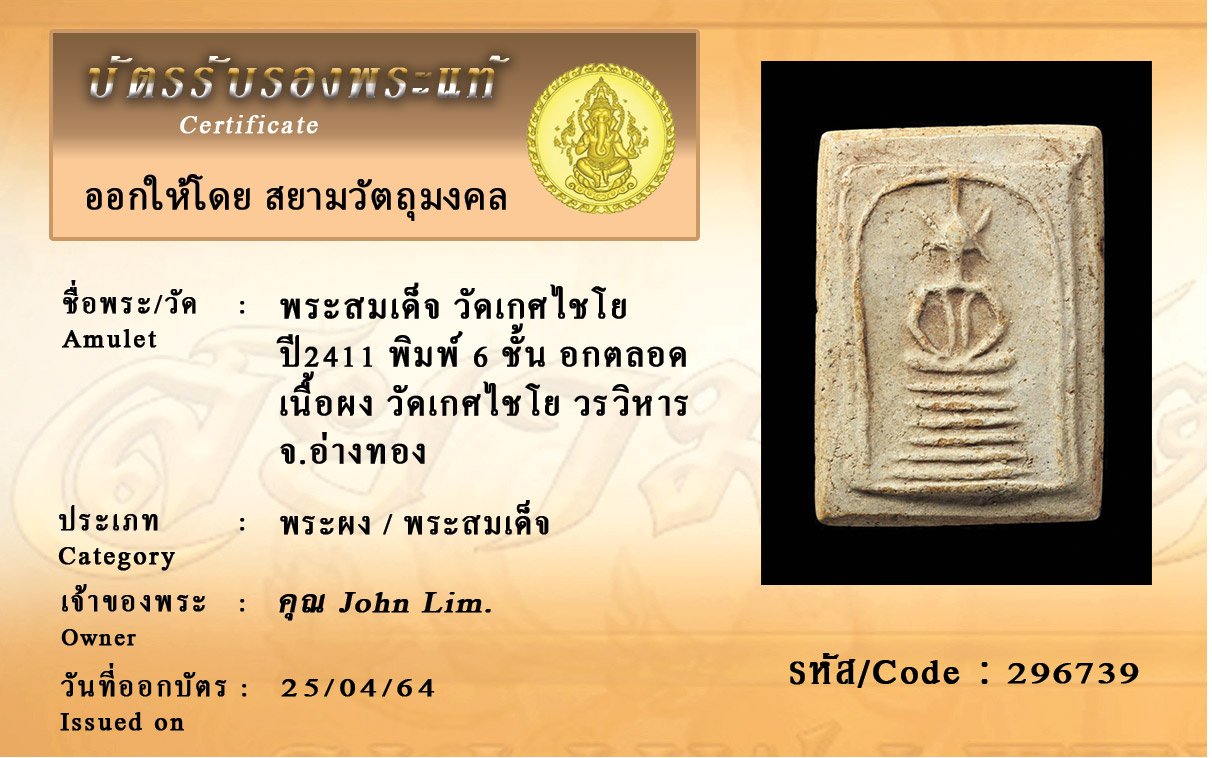 รหัสสินค้า : 296739 พระสมเด็จ วัดเกศไชโย ปี2411 พิมพ์ 6 ชั้น อกตลอด เนื้อผง วัดเกศไชโย วรวิหาร จ.อ่างทอง