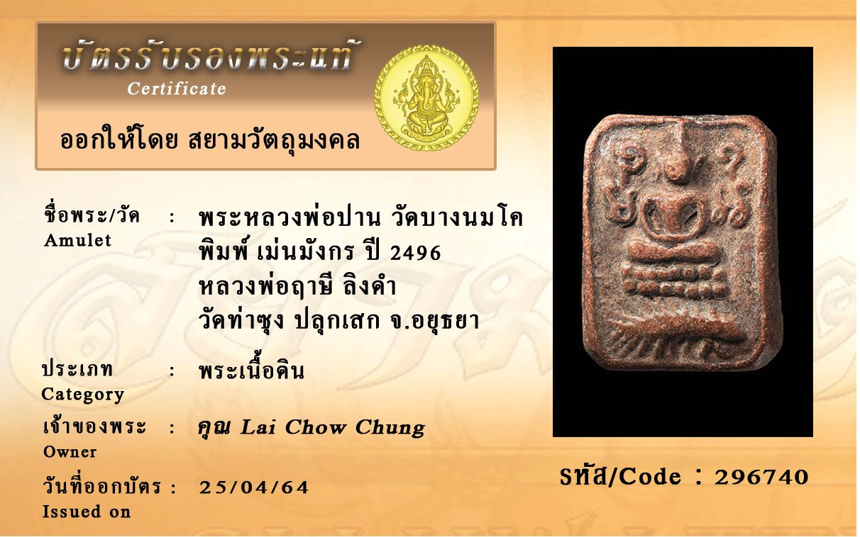 รหัสสินค้า : 296740 พระหลวงพ่อปาน วัดบางนมโค พิมพ์ เม่นมังกร ปี 2496 หลวงพ่อฤาษี ลิงดำ วัดท่าซุง ปลุกเสก จังหวัดอยุธยา