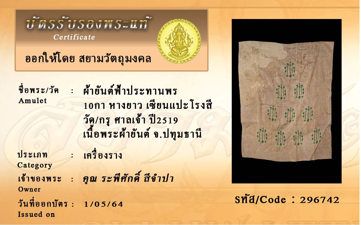 รหัสสินค้า : 296742 ผ้ายันต์ฟ้าประทานพร 10กา หางยาว เซียนแปะโรงสี วัด/กรุ ศาลเจ้า ปี2519 เนื้อพระผ้ายันต์ จ.ปทุมธานี