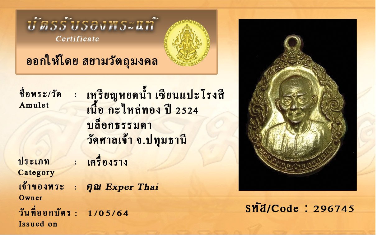 รหัสสินค้า : 296745 เหรียญหยดน้ำ เซียนแปะโรงสี เนื้อ กะไหล่ทอง ปี 2524 บล็อกธรรมดา วัดศาลเจ้า จ.ปทุมธานี