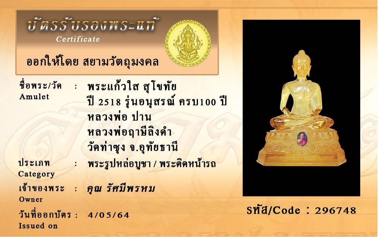 รหัสสินค้า : 296748 พระแก้วใส สุโขทัย ปี 2518 รุ่นอนุสรณ์ครบ100 ปี หลวงพ่อ ปาน หลวงพ่อฤาษีลิงดำ วัดท่าซุง อุทัยธานี