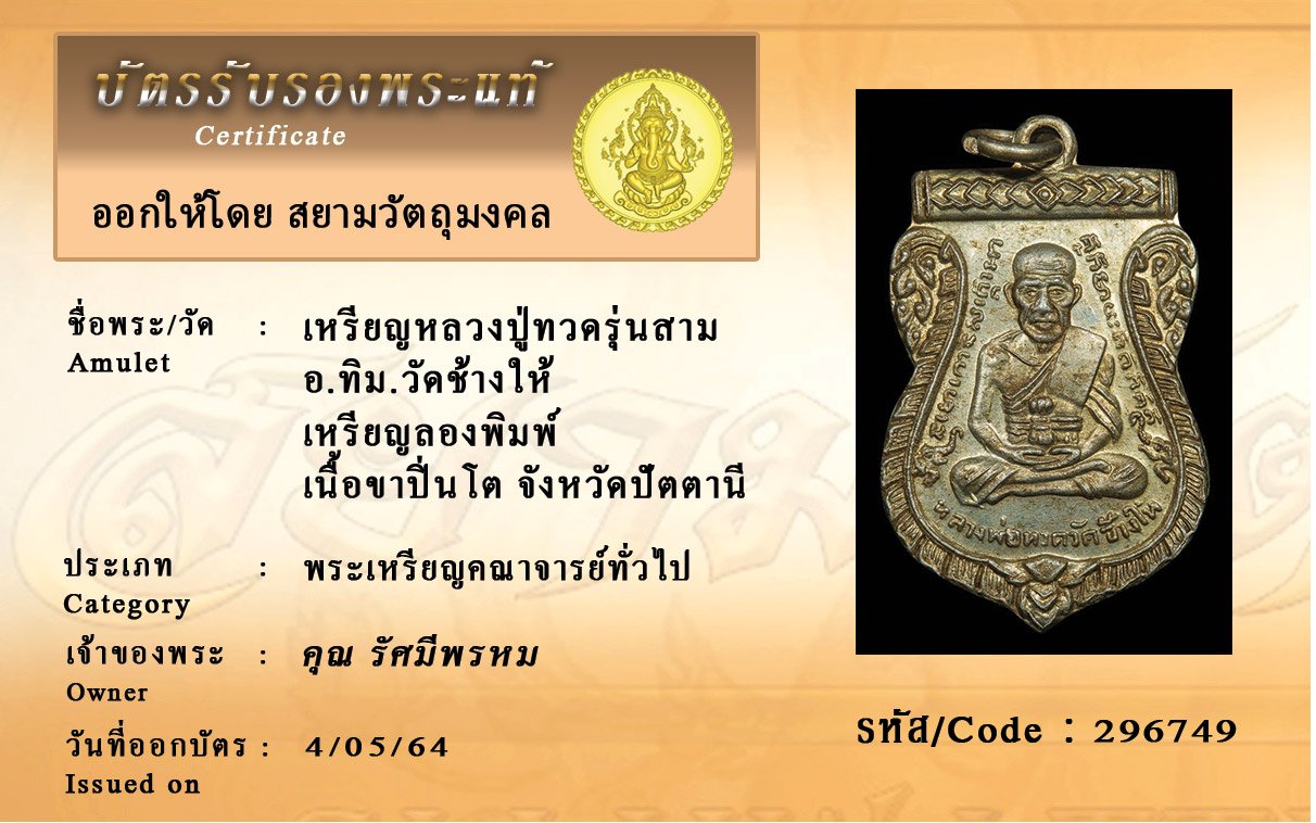 รหัสสินค้า : 296749 เหรียญหลวงปู่ทวดรุ่นสาม อ.ทิม.วัดช้างให้ เหรียญลองพิมพ์ เนื้อขาปิ่นโต จังหวัดปัตตานี