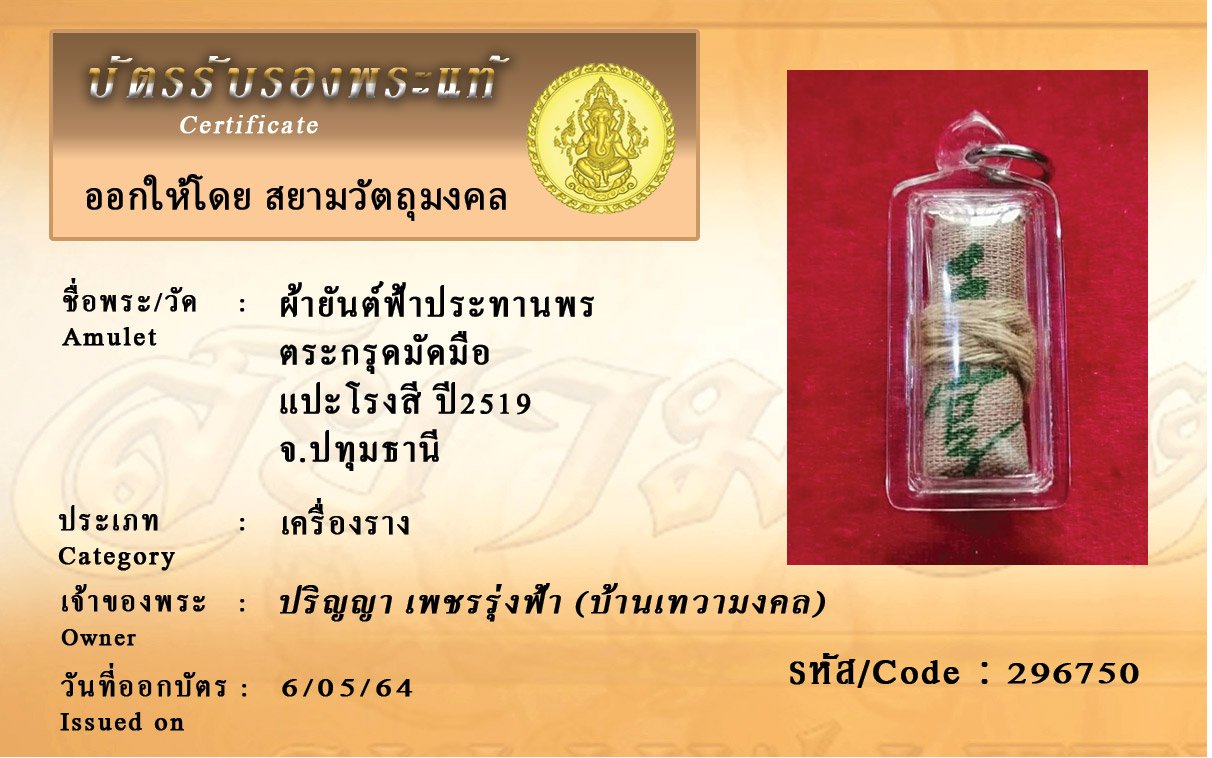 รหัสสินค้า : 296750 ผ้ายันต์ฟ้าประทานพร ตระกรุดมัดมือ แปะโรงสี ปี2519 จ.ปทุมธานี