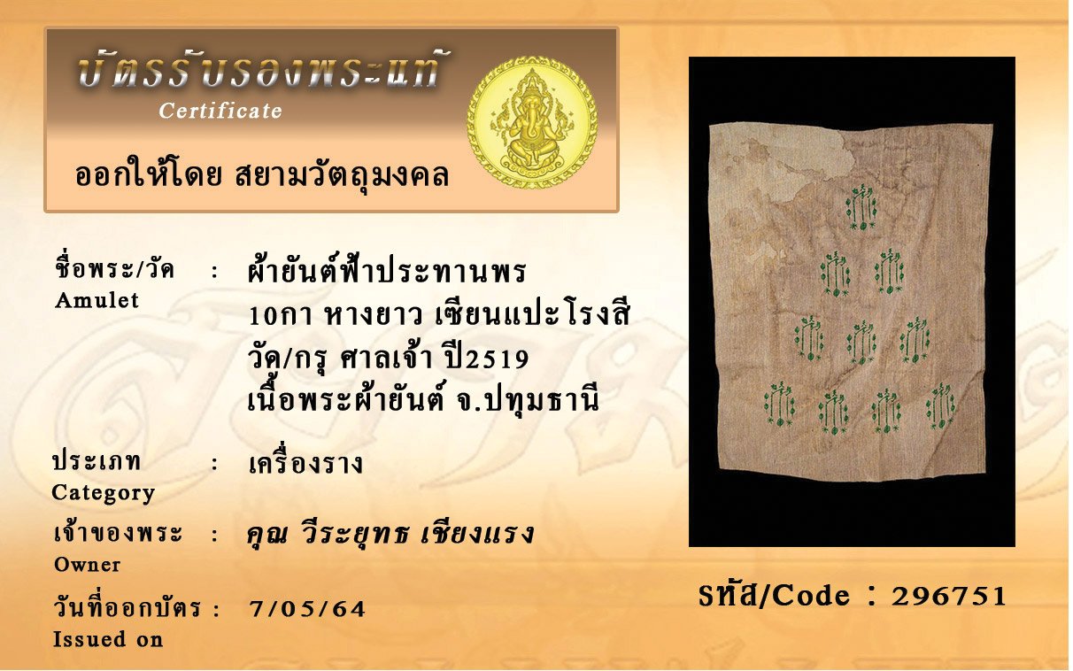 รหัสสินค้า : 296751 ผ้ายันต์ฟ้าประทานพร เซียนแปะโรงสี พิมพ์10 กาหางยาว ปี 2519 วัด/กรุ ศาลเจ้า จ.ปทุมธานี