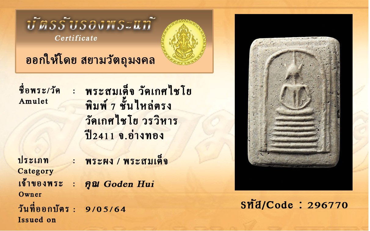 รหัสสินค้า : 296770 พระสมเด็จ วัดเกศไชโย พิมพ์ 7 ชั้นไหล่ตรง วัดเกศไชโย วรวิหาร ปี2411 จ.อ่างทอง