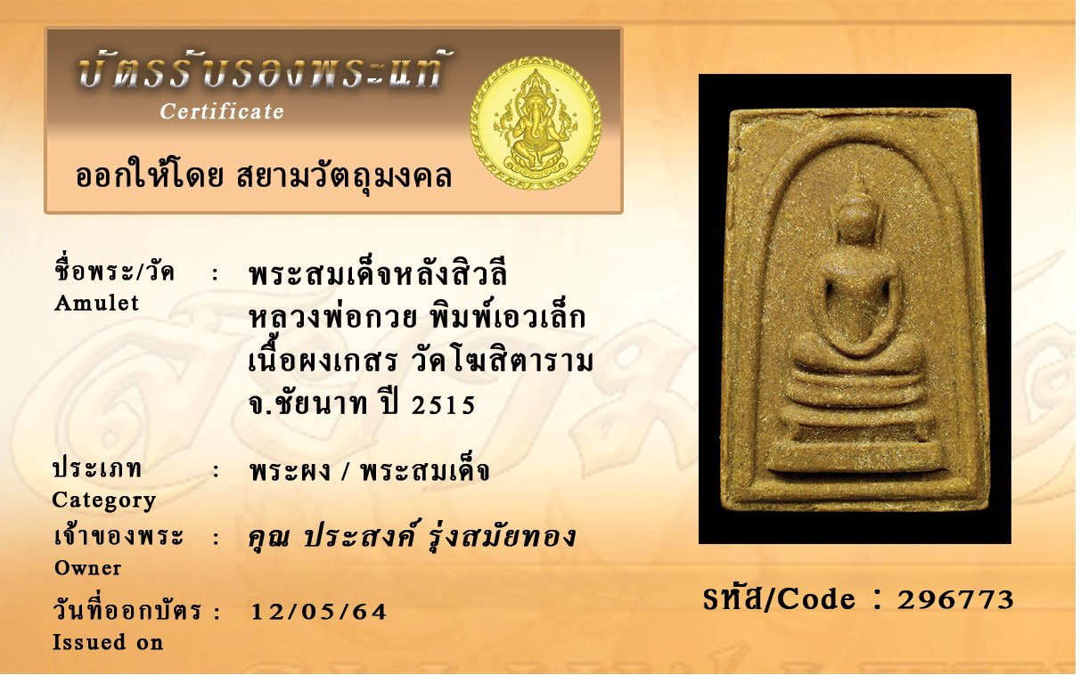 รหัสสินค้า : 296773 พระสมเด็จหลังสิวลี หลวงพ่อกวย พิมพ์เอวเล็ก เนื้อผงเกสร วัดโฆสิตาราม จ.ชัยนาท ปี 2515