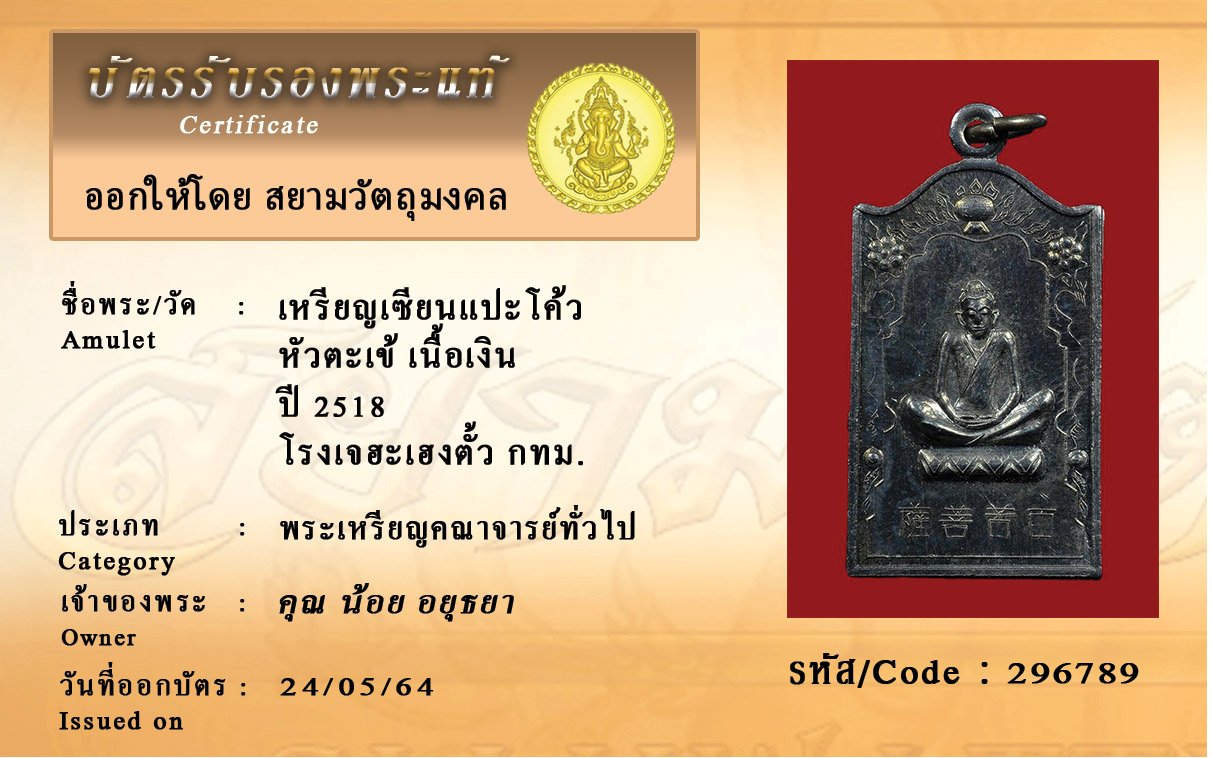 รหัสสินค้า : 296789 เหรียญเซียนแปะโค้ว หัวตะเข้ เนื้อเงิน ปี 2518 โรงเจฮะเฮงตั้ว กทม.