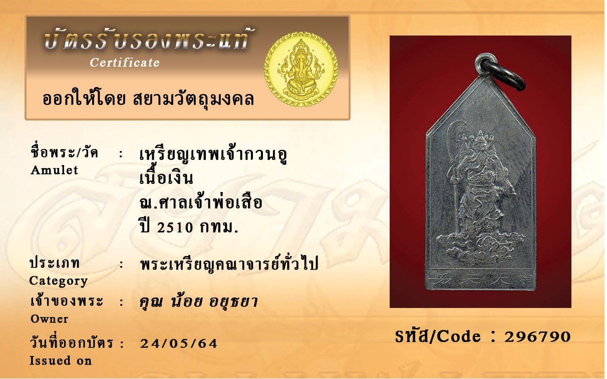 รหัสสินค้า : 296790 เหรียญเทพเจ้ากวนอู เนื้อเงิน ณ.ศาลเจ้าพ่อเสือ ปี 2510 กทม.