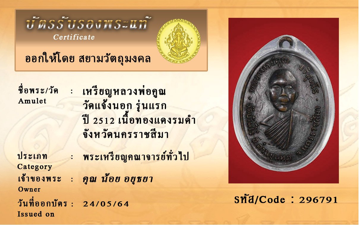 รหัสสินค้า : 296791 เหรียญหลวงพ่อคูณ วัดแจ้งนอก รุ่นแรก ปี 2512 เนื้อทองแดงรมดำ จังหวัดนครราชสีมา