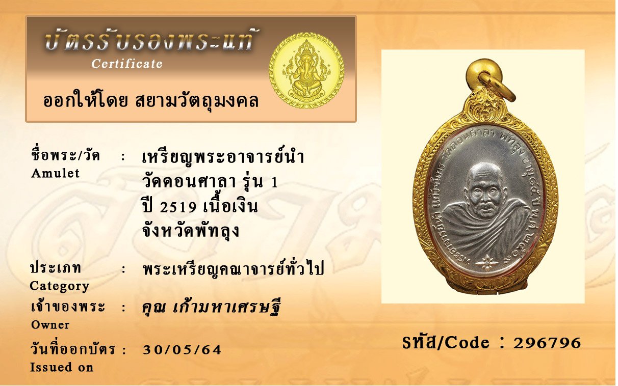 รหัสสินค้า : 296796 เหรียญพระอาจารย์นำ วัดดอนศาลา รุ่น 1 ปี 2519 เนื้อเงิน จังหวัดพัทลุง