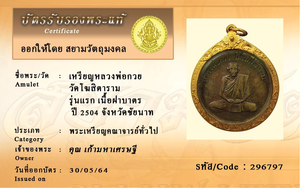 รหัสสินค้า : 296797 เหรียญหลวงพ่อกวย วัดโฆสิตาราม รุ่นแรก เนื้อฝาบาตร ปี 2504 จังหวัดชัยนาท