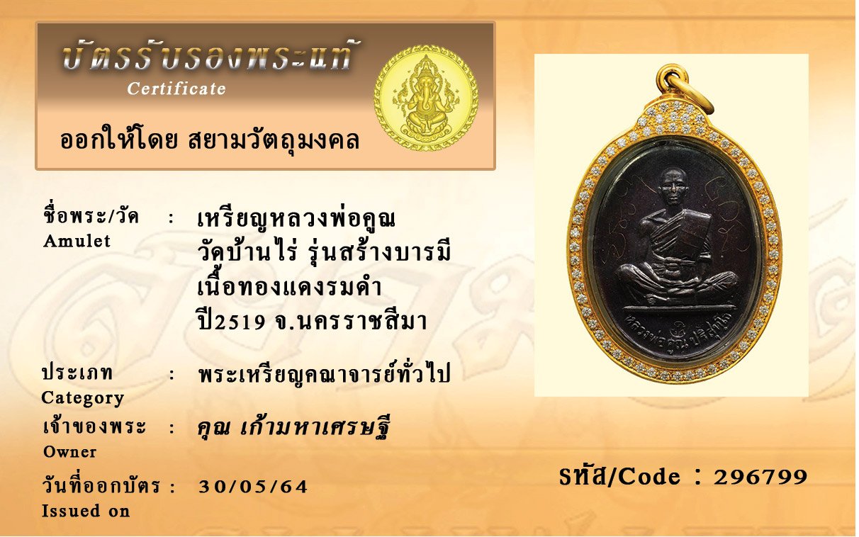 รหัสสินค้า : 296799 เหรียญหลวงพ่อคูณ วัดบ้านไร่ รุ่นสร้างบารมี เนื้อทองแดงรมดำ ปี2519 จ.นครราชสีมา