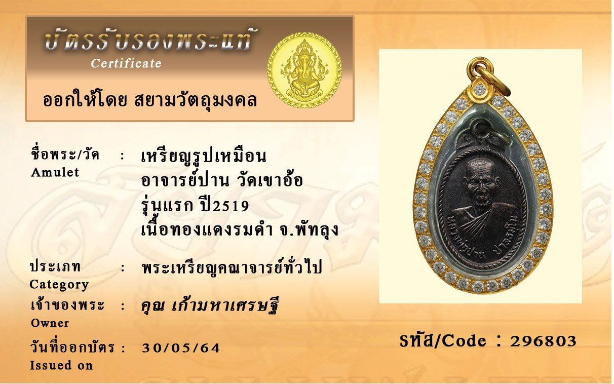 รหัสสินค้า : 296803 เหรียญรูปเหมือน อาจารย์ปาน วัดเขาอ้อ รุ่นแรก ปี2519 เนื้อทองแดงรมดำ จ.พัทลุง