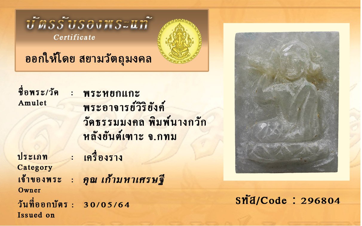 รหัสสินค้า : 296804 พระหยกแกะ พระอาจารย์วิริยังค์ วัดธรรมมงคล พิมพ์นางกวัก หลังยันต์เฑาะ จ.กทม