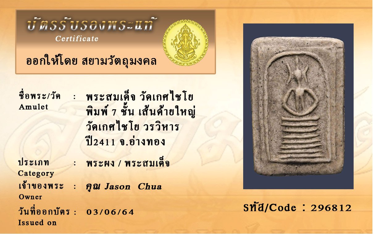 รหัสสินค้า : 296812 พระสมเด็จ วัดเกศไชโย พิมพ์ 7 ชั้น เส้นด้ายใหญ่ วัดเกศไชโย วรวิหาร ปี2411 จ.อ่างทอง