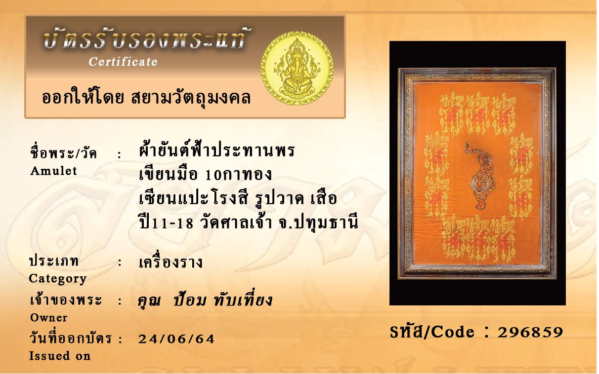 รหัสสินค้า : 296859 ผ้ายันต์ฟ้าประทานพร เขียนมือ 10กาทอง เซียนแปะโรงสี รูปวาด เสือ ปี11-18 วัดศาลเจ้า จังหวัดปทุมธานี