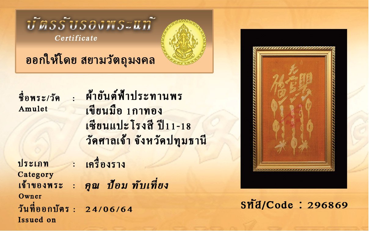 รหัสสินค้า : 296869 ผ้ายันต์ฟ้าประทานพร เขียนมือ 1กาทอง เซียนแปะโรงสี ปี11-18 วัดศาลเจ้า จังหวัดปทุมธานี