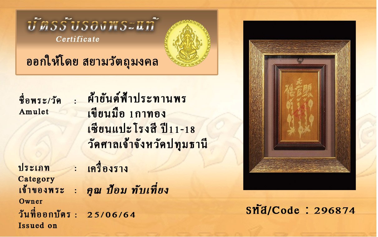 รหัสสินค้า : 296874 ผ้ายันต์ฟ้าประทานพร เขียนมือ 1กาทอง เซียนแปะโรงสี ปี11-18 วัดศาลเจ้าจังหวัดปทุมธานี