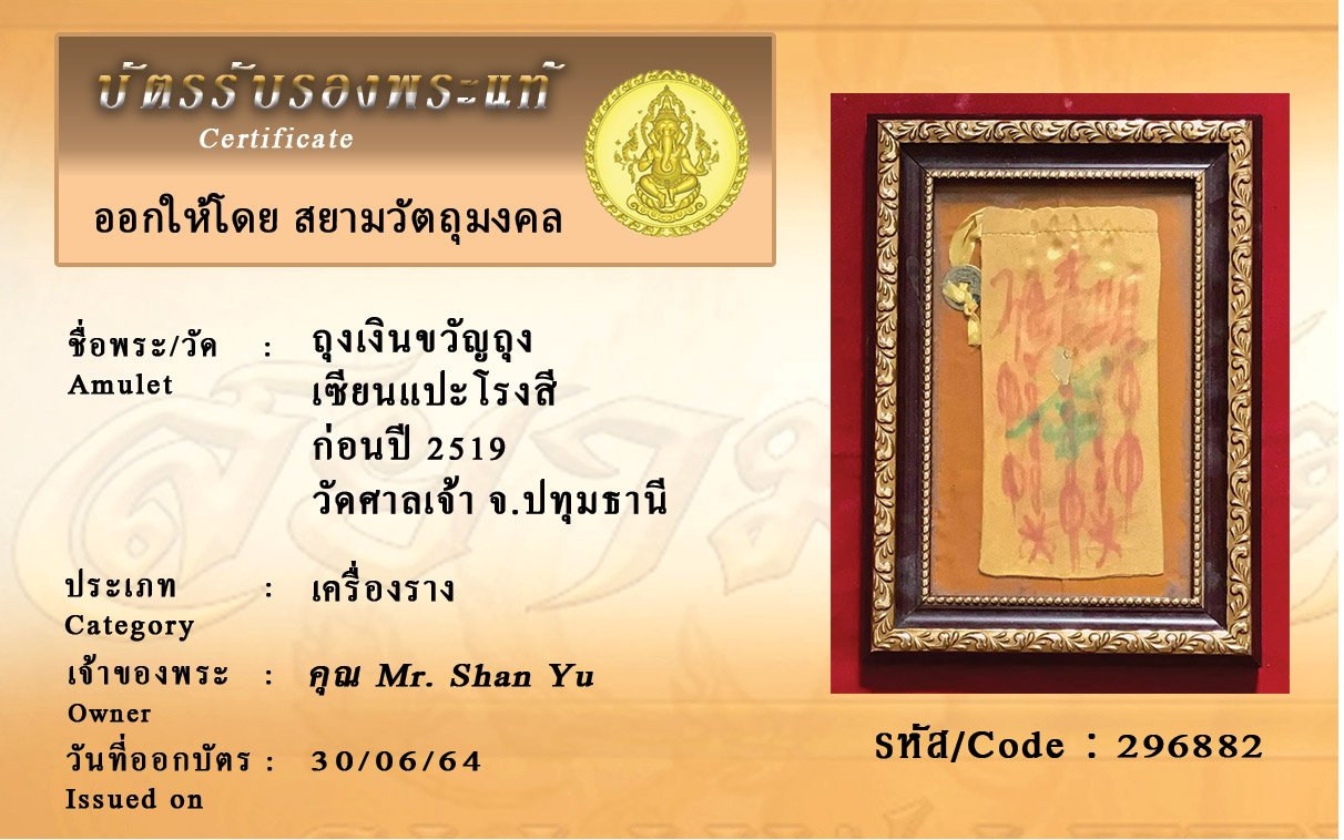 รหัสสินค้า : 296882 ถุงเงินขวัญถุง เซียนแปะโรงสี ก่อนปี 2519 วัดศาลเจ้า จ.ปทุมธานี
