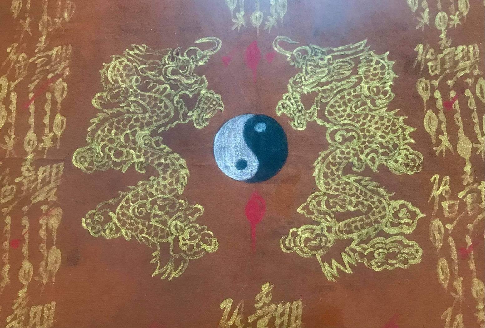 รหัสสินค้า : 296892 ผ้ายันต์ 18 กา เขียนมือหมึกทอง อาแปะโรงสี โง้วกิมโคย รูปวาดมังกรทะยานฟ้า หยิน-หยาง ก่อนปี 2519 จ.ปทุมธานี