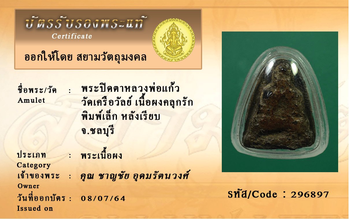 รหัสสินค้า : 296897 พระปิดตาหลวงพ่อแก้ว วัดเครือวัลย์ เนื้อผงคลุกรัก พิมพ์เล็ก หลังเรียบ จ.ชลบุรี