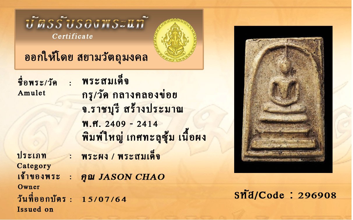 รหัสสินค้า : 296908 พระสมเด็จ กรุ/วัด กลางคลองข่อย จ.ราชบุรี สร้างประมาณ พ.ศ. 2409 - 2414 พิมพ์ใหญ่ เกศทะลุซุ้ม เนื้อผง