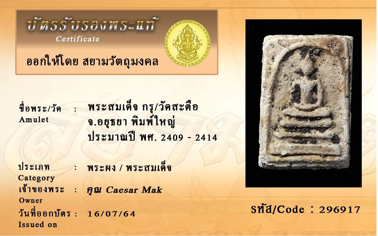 รหัสสินค้า : 296917 พระสมเด็จ กรุ/วัดสะตือ จ.อยุธยา พิมพ์ใหญ่ ประมาณปี พศ. 2409 - 2414