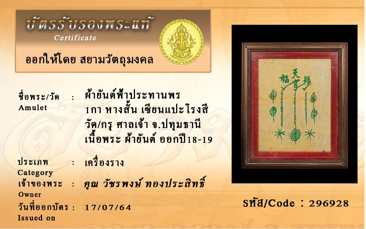 รหัสสินค้า : 296928 ผ้ายันต์ฟ้าประทานพร 1กา หางสั้น เซียนแปะโรงสี วัด/กรุ ศาลเจ้า จ.ปทุมธานี เนื้อพระ ผ้ายันต์ ออกปี18-19