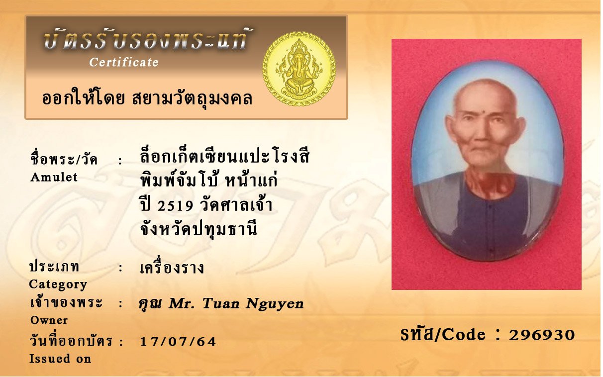 รหัสสินค้า : 296930 ล็อกเก็ตเซียนแปะโรงสี พิมพ์จัมโบ้ หน้าแก่ ปี 2519 วัดศาล เจ้าจังหวัดปทุมธานี