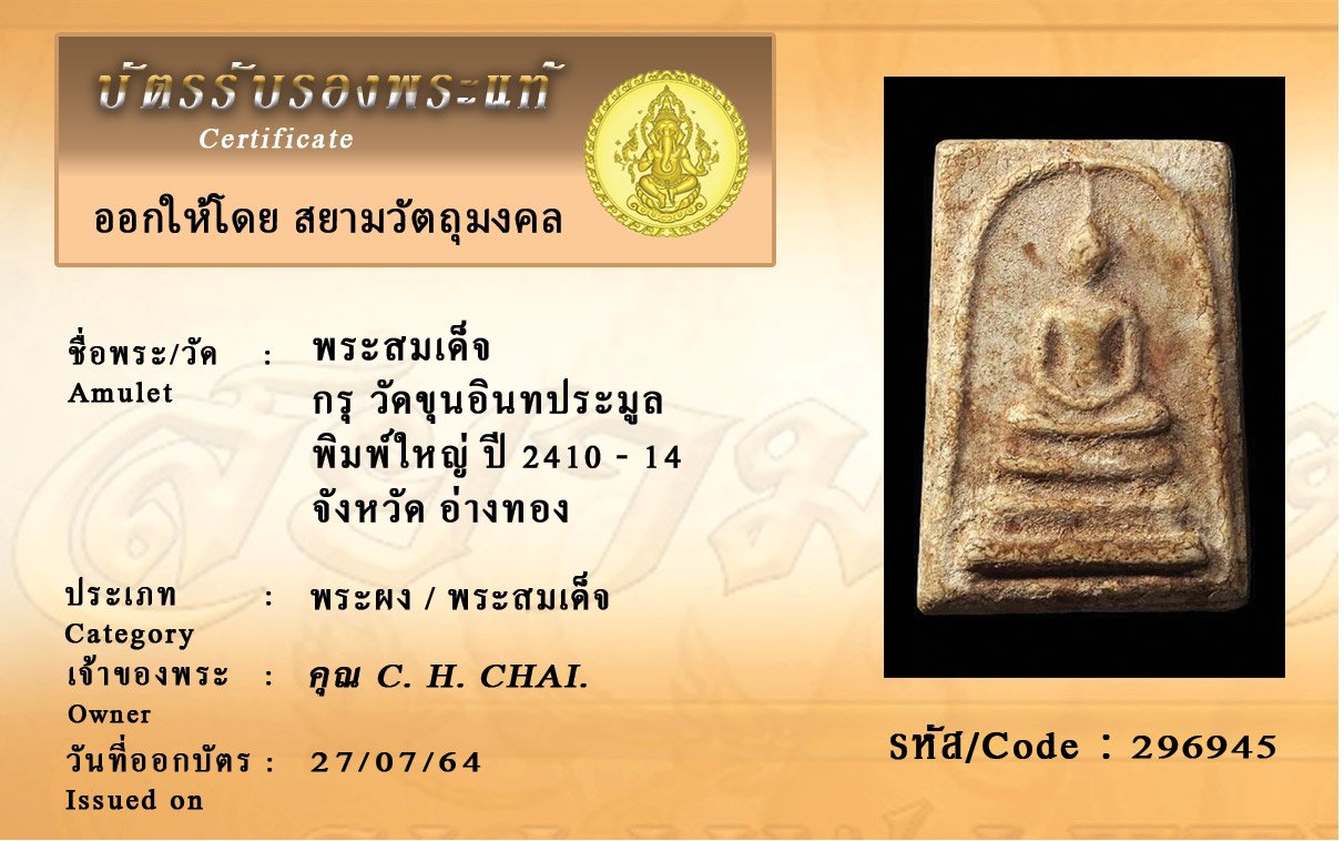 รหัสสินค้า : 296945 พระสมเด็จ กรุ วัดขุนอินทประมูล พิมพ์ใหญ่ ปี 2410 - 14 จังหวัด อ่างทอง